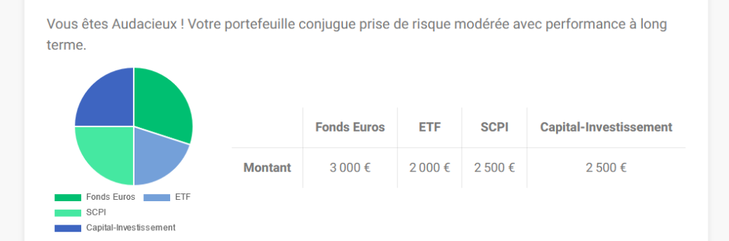 Par exemple, le profil “avisé” compte 50 % de fonds euro, 20 % de SCPI, 10 % d’ETF et 20 % de Private Equity.